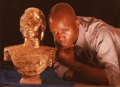Title: Michael Jackson Sculptor Nijel with the finished ceramic gold Michael Jackson portrait bust.